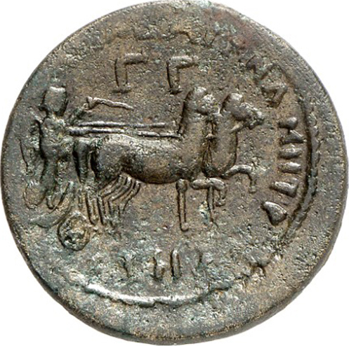 Nike driving biga of horses, right, holding reins and palm |