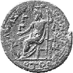 Sarapis seated left, extending arm over Cerberus, holding sceptre |