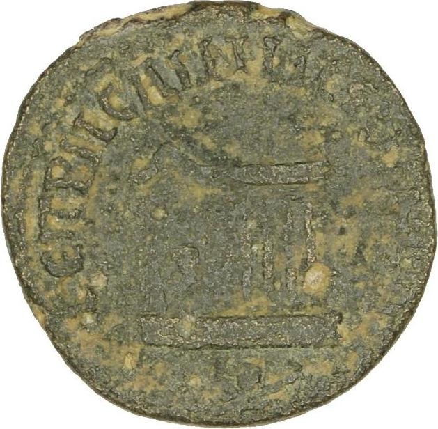 temple (without roof) seen in perspective enclosing eagle with closed wings; in exergue, river god (Chaboras) swimming between two palms