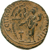 Tyche standing left, holding patera over lighted altar and cornucopia; above, eagle on palm with wreath in beak; at left, palm; sometimes at right, another palm |