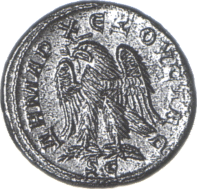 laureate, draped and cuirassed bust of Decius, right, seen from rear; below bust: ••••• |