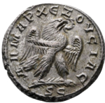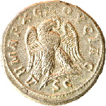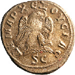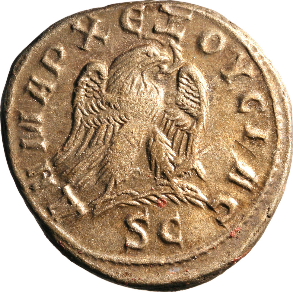 laureate, draped and cuirassed bust of Decius, right, seen from rear; below bust: •• |