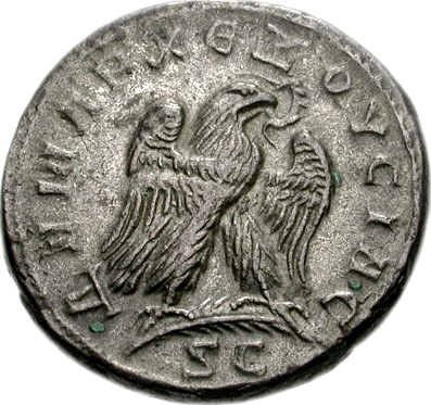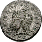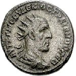 radiate, draped and cuirassed bust of Decius, right, seen from rear; below bust: ••• |