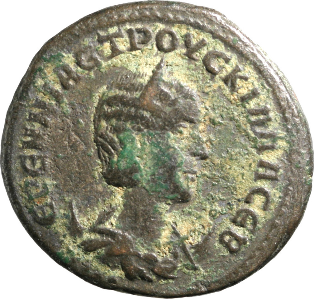 diademed and draped bust of Etruscilla, right, on crescent; below bust: ••••