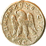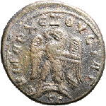 radiate, draped and cuirassed bust of Decius, right, seen from rear; below bust: ••••• |