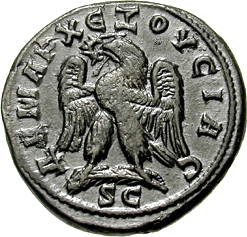 eagle standing on palm, left, spreading wings, holding wreath in beak