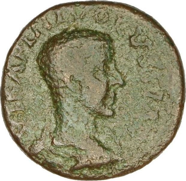 bare-headed, draped and cuirassed bust of Volusian, right, seen from rear