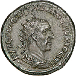 radiate, draped and cuirassed bust of Decius, right, seen from rear; below bust: ••••• |