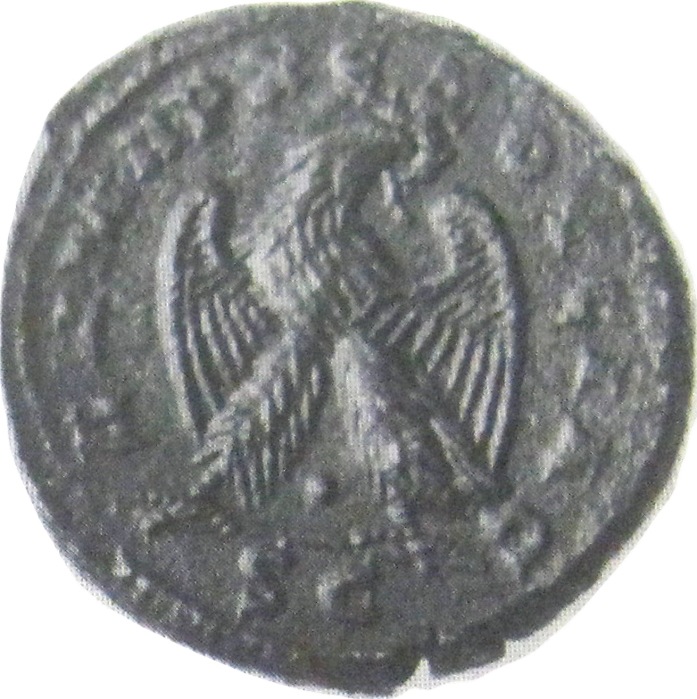 eagle standing on line, facing, head right, spreading wings, holding wreath in beak; pellet between legs