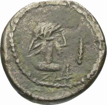 laureate head of the Roman emperor, right; before, club
