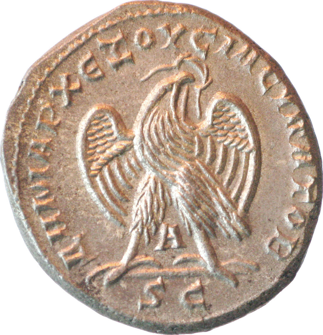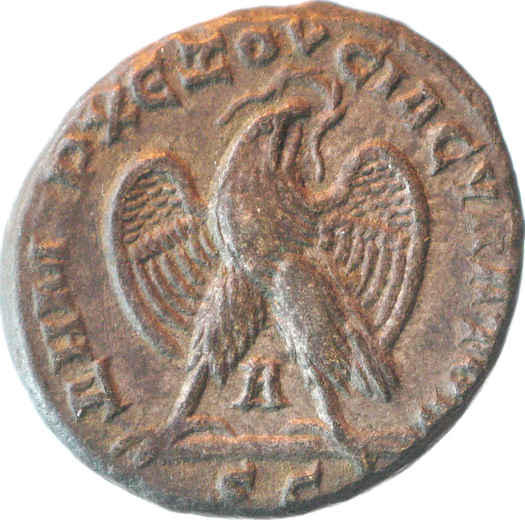 eagle standing on line, facing, head right, spreading wings, holding wreath in beak; between legs: Α |