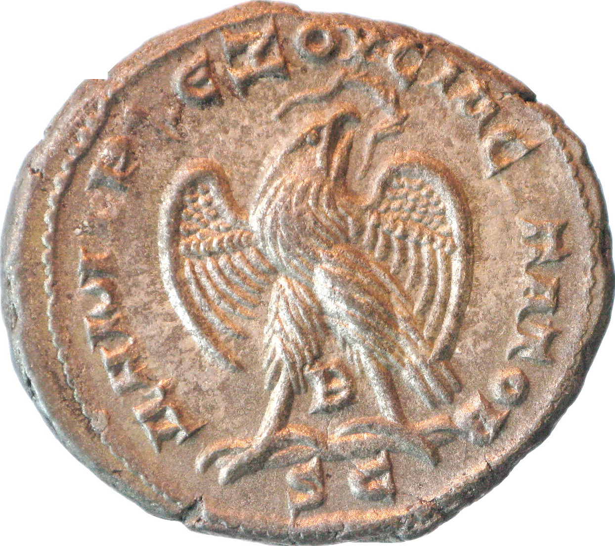 eagle standing on line, facing, head right, spreading wings, holding wreath in beak; between legs: Β |
