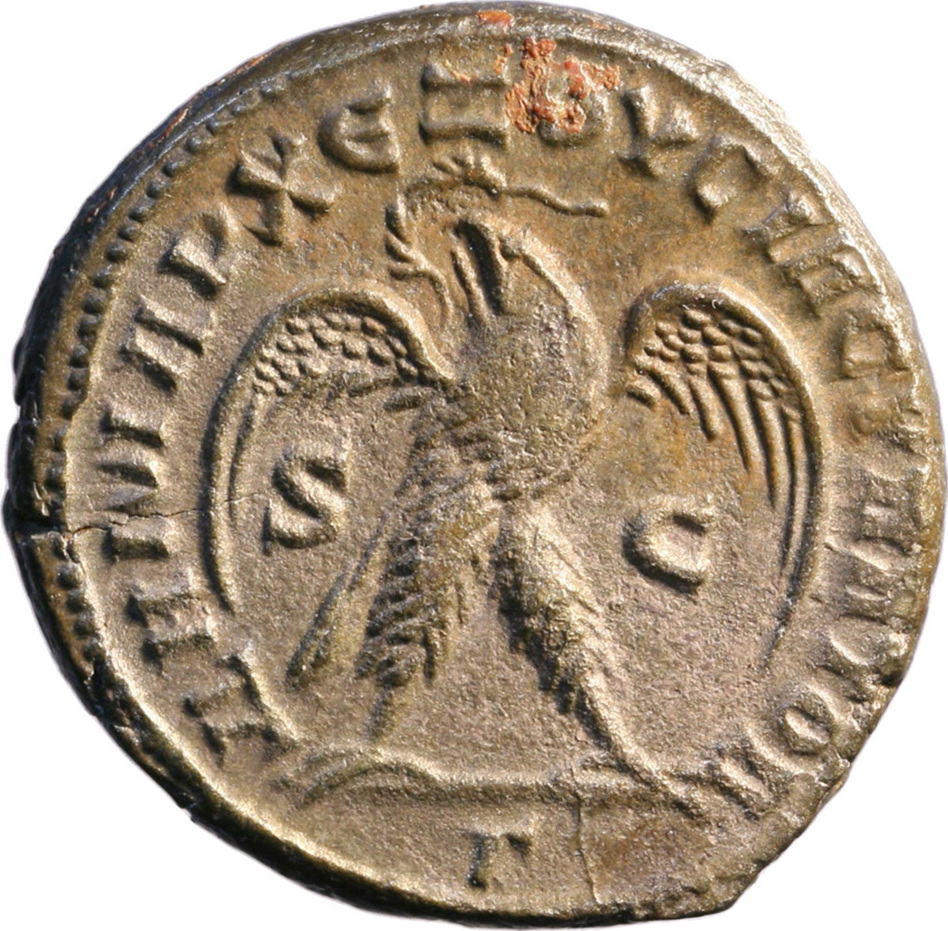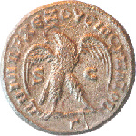 eagle standing on line, facing, head left, spreading wings, holding wreath in beak; in exergue: Γ |