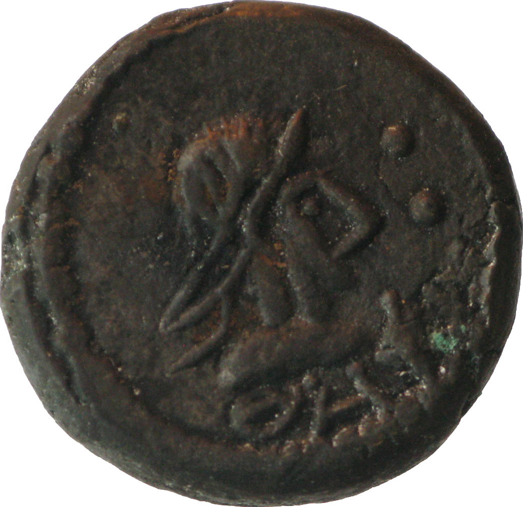 laureate head of the Roman emperor, right; before, •• (vertical)