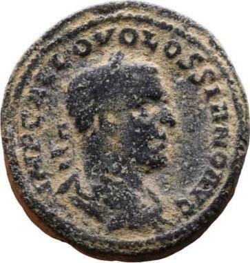 laureate, draped and cuirassed bust of Volusian, right, seen from rear
