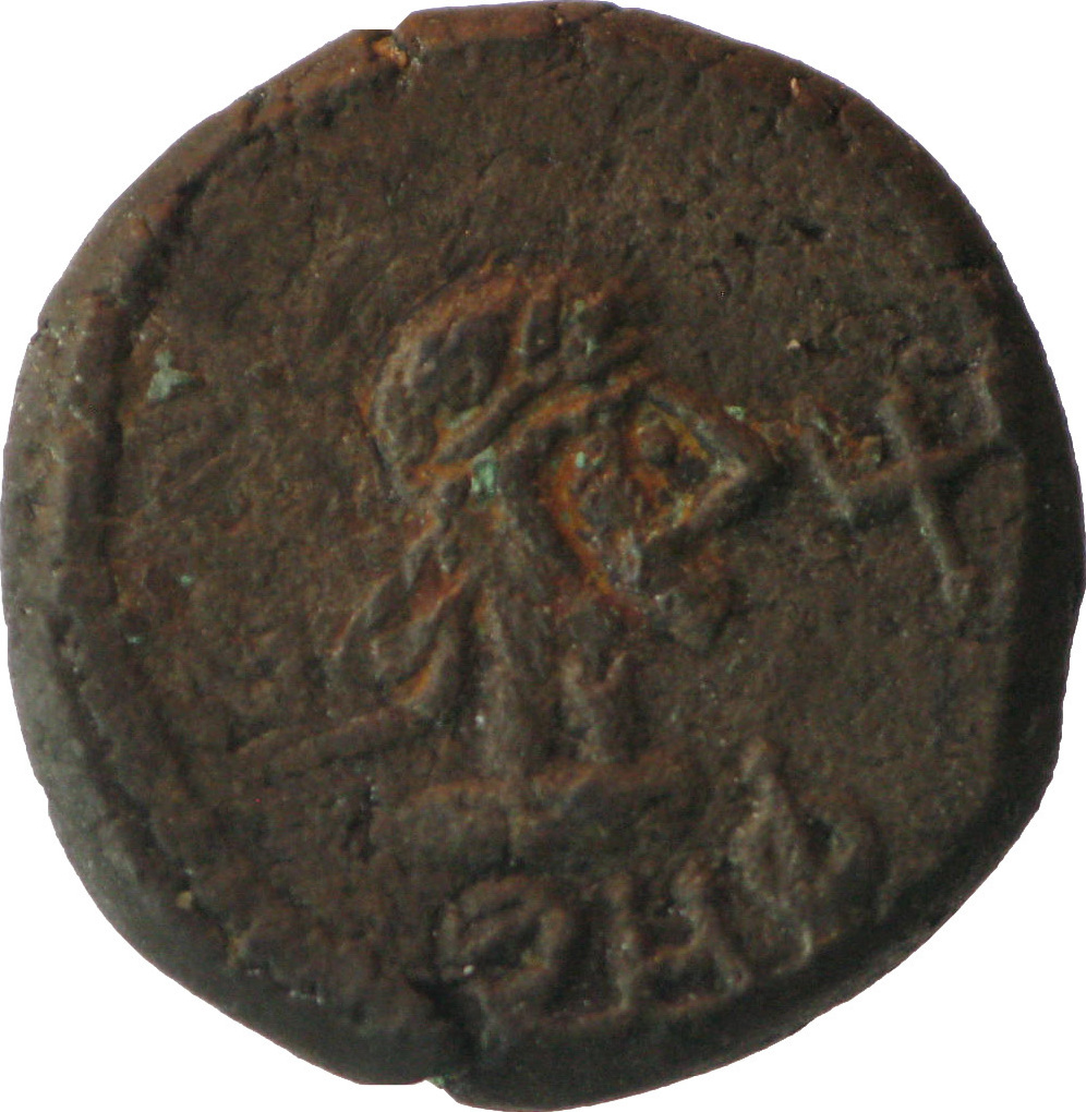 laureate head of the Roman emperor, right; before, trident