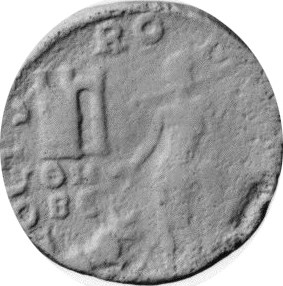 Cadmus standing left, holding patera, spear and drapery; at feet, left, bull lying; at top, left, city gate of Thebes with towers; under the gate, ΘΗΒƐ; at right, murex shell