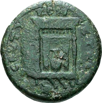laureate, draped and cuirassed bust of Gallus, right, seen from rear |