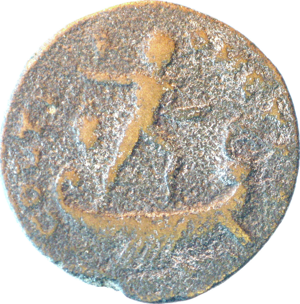 nude Cadmus advancing right, head left, holding sword and raising right arm, on galley, left, with shield on aphlaston at stern ending; left, murex shell