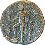 nude Diomedes standing left, holding the palladium and spear, right foot on prow of ship; at left, murex; at right, palm tree