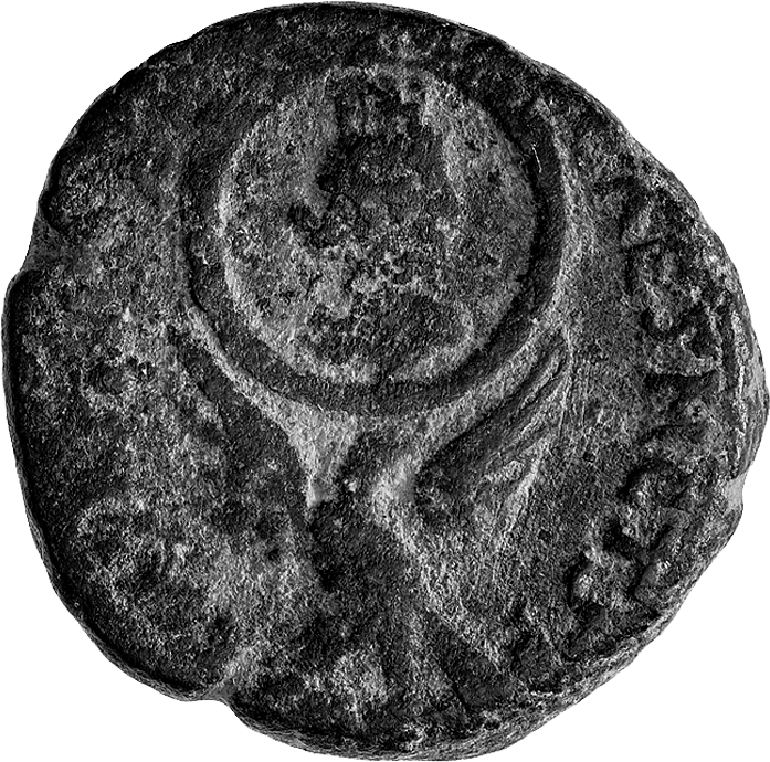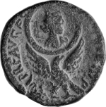 eagle standing on line, facing, head right, spreading wings, supporting plain circle enclosing turreted and draped bust of Fortuna, right |