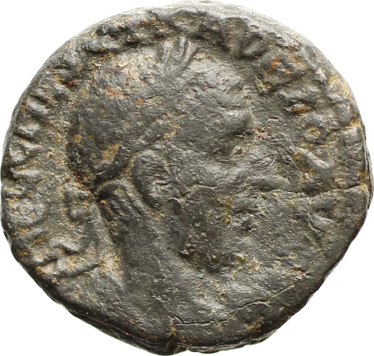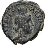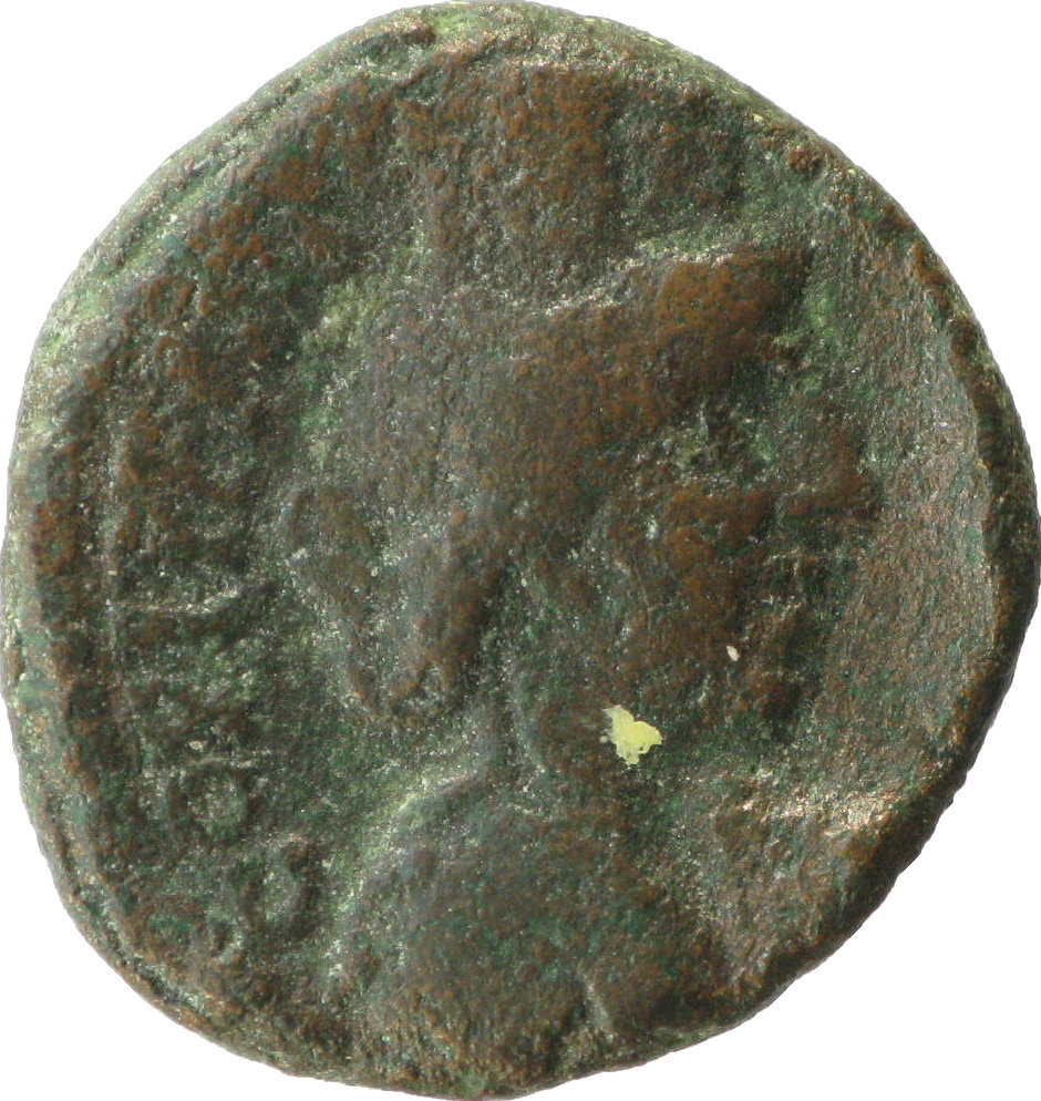 turreted bust of Fortuna, right, with drapery on shoulder |