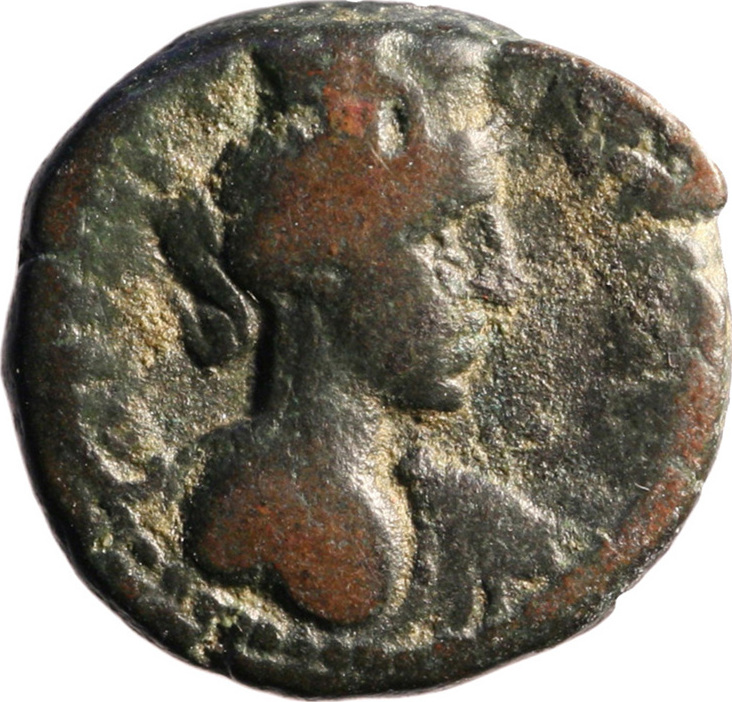 turreted bust of Fortuna, right, with drapery on shoulder |