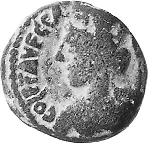 turreted bust of Fortuna, left, with drapery on shoulder |