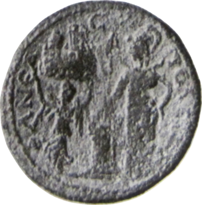 at left, Nike advancing right, supporting Mount Gerizim; at right, Athena(?) standing left, holding sceptre, shield at her feet; between them, altar
