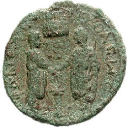 Gallus and Volusian standing facing each other, each holding spear, shaking hand; between them, altar and star; above, Mount Gerizim flanked by star and crescent