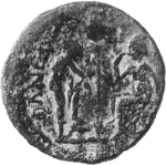 helmeted male figure standing right, foot on rock, extending hand, facing female figure seated left, raising hand to lips; between them, spear planted downwards and, above, Mount Gerizim