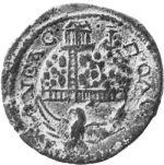 Mount Gerizim with temple in perspective, and altar (on the left), steep stairway and colonnade; below, eagle facing, head left, spreading wings; sometimes, at top, crescent and star