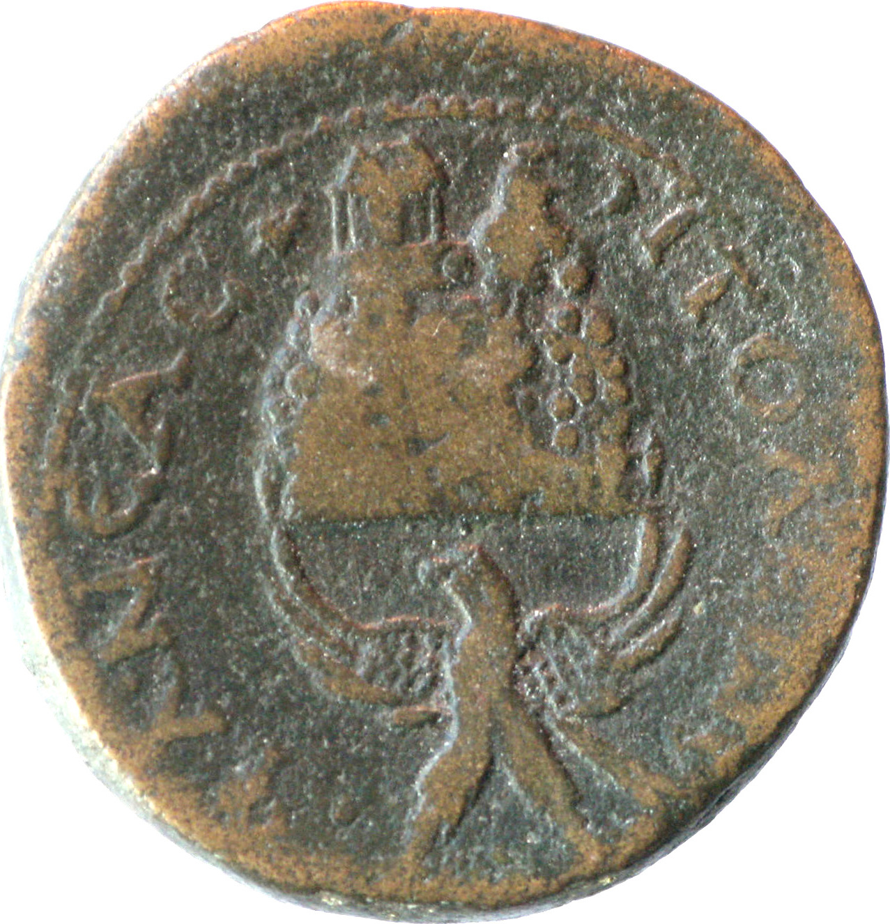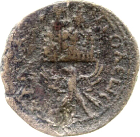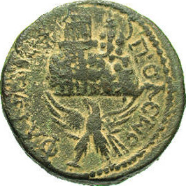 Mount Gerizim with temple in perspective, and altar (on the left), steep stairway and colonnade; below, eagle facing, head left, spreading wings; at top, crescent and star