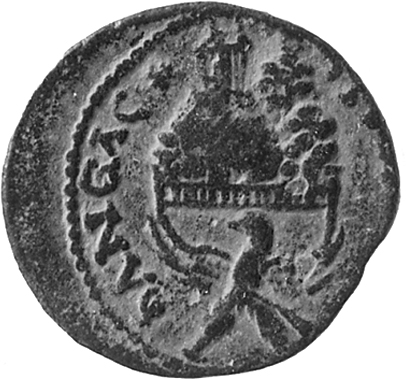 Mount Gerizim with temple in perspective, and altar (on the left), steep stairway and colonnade; below, eagle facing, head left, spreading wings; sometimes, at top, crescent and star