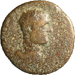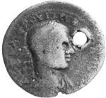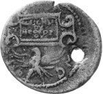 inscription on tablet with voluted ansae; below, eagle standing left, spreading wings |
