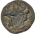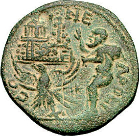 at left, Mount Gerizim with temple in perspective and colonnade; below, eagle facing, head left, spreading wings; at right, Marsyas standing left, raising hand, carrying wineskin over shoulder