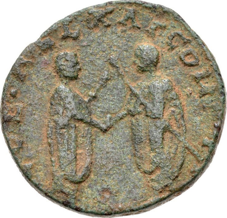 Decius, togate, standing right, holding sceptre, and Etruscus, togate, standing left, facing each other, clasping hands
