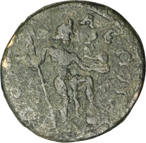 Poseidon standing right, holding trident and dolphin; left foot on prow of galley