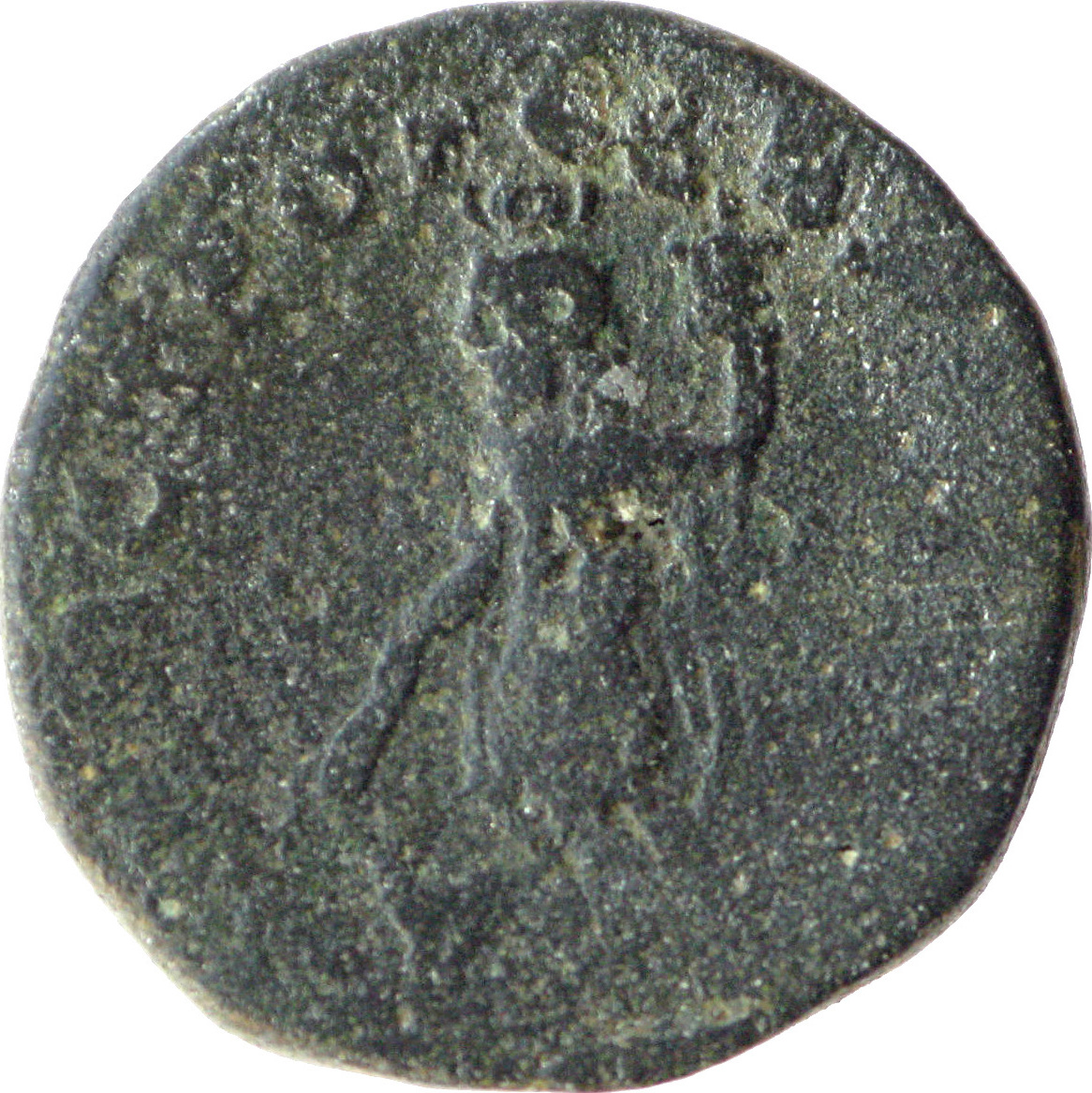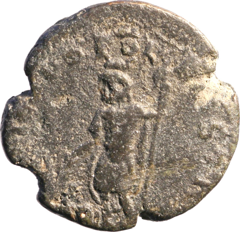 Jupiter Ammon standing left, in military dress, with headdress of ram’s horns and disk, holding ears of corn(?) and sceptre surmounted by trophy; at feet, left, ram standing left, head right