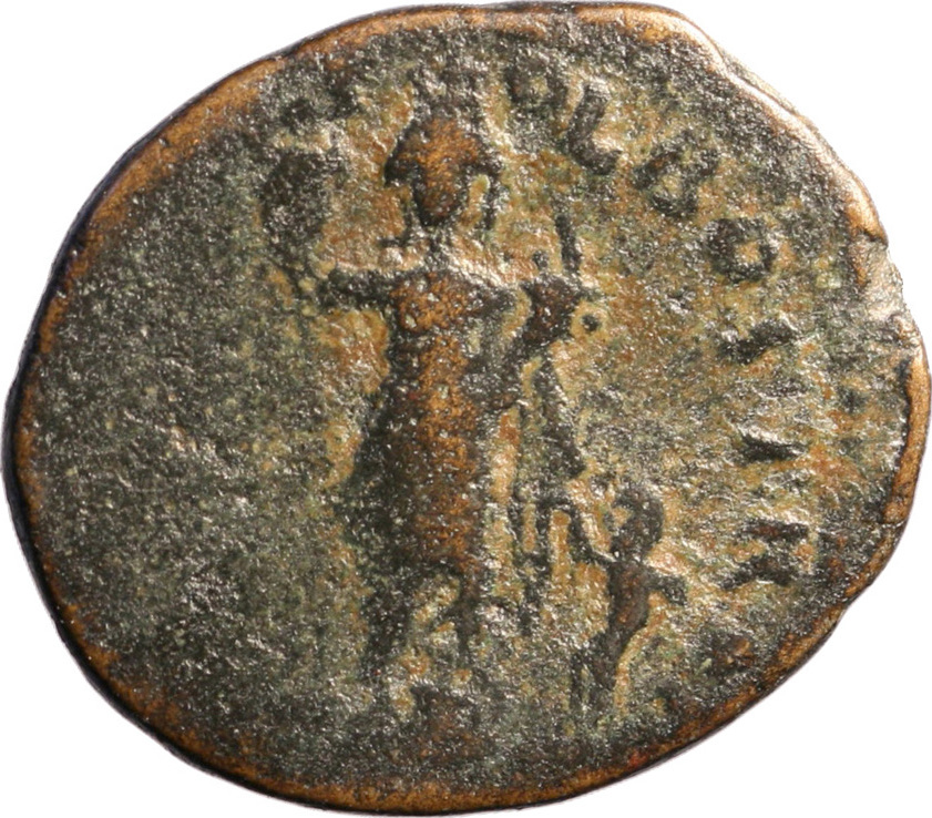 Fortuna standing facing, holding sceptre surmounted by trophy and cornucopia, left foot on small crouching figure(?); at right, nude Marsyas standing left, raising arm, holding wineskin over shoulder
