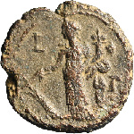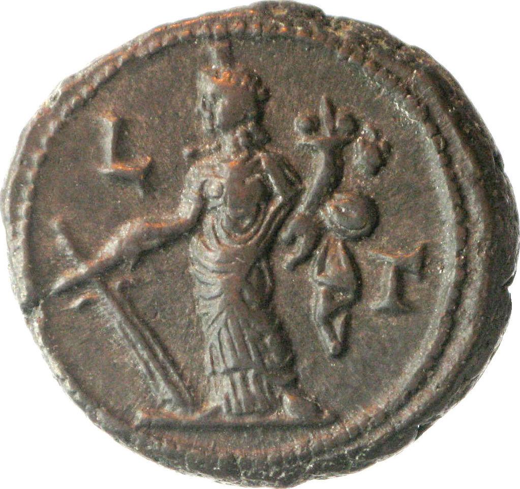 Reverse design Tyche standing left, holding rudder and cornucopia