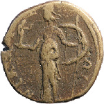 radiate, draped and cuirassed bust of Etruscus, right, seen from rear |