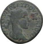 radiate, draped and cuirassed bust of Etruscus, right, seen from rear |
