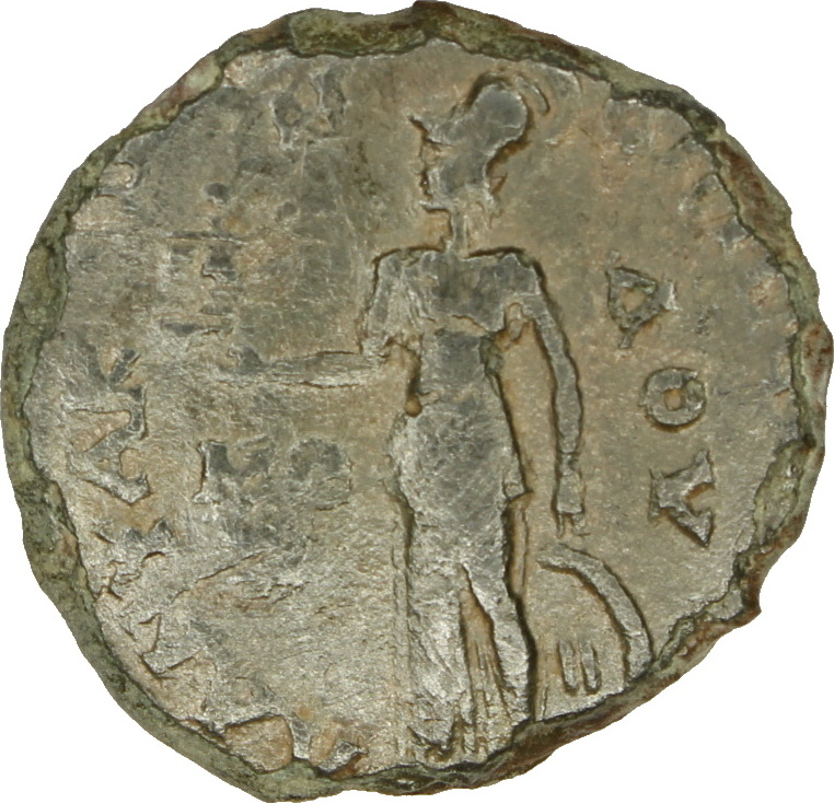 Athena standing left, holding Nike and shield