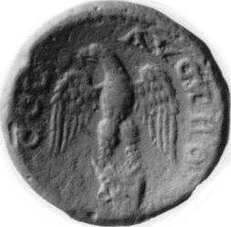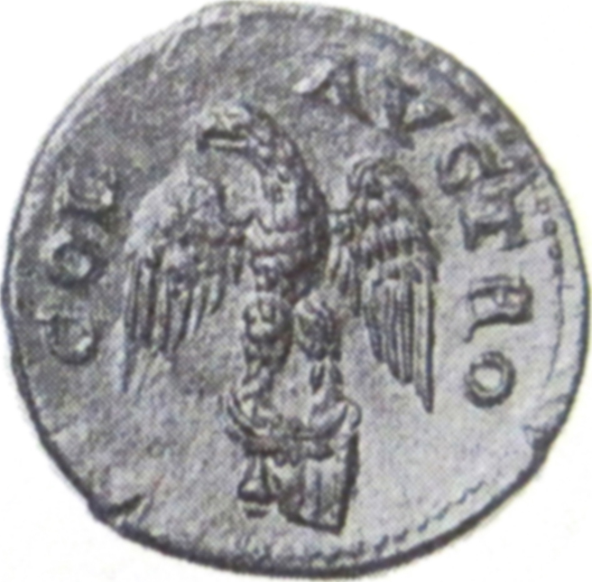 eagle facing, spreading wings, head left, holding bucranium in claw