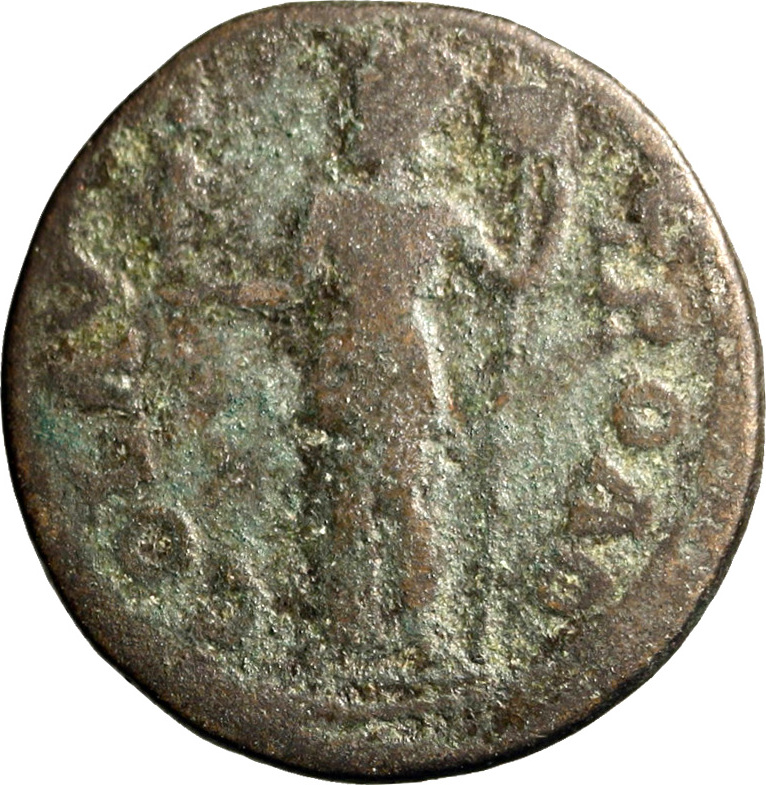 turreted Fortuna standing left, holding cult statue of Apollo Smintheus and standard