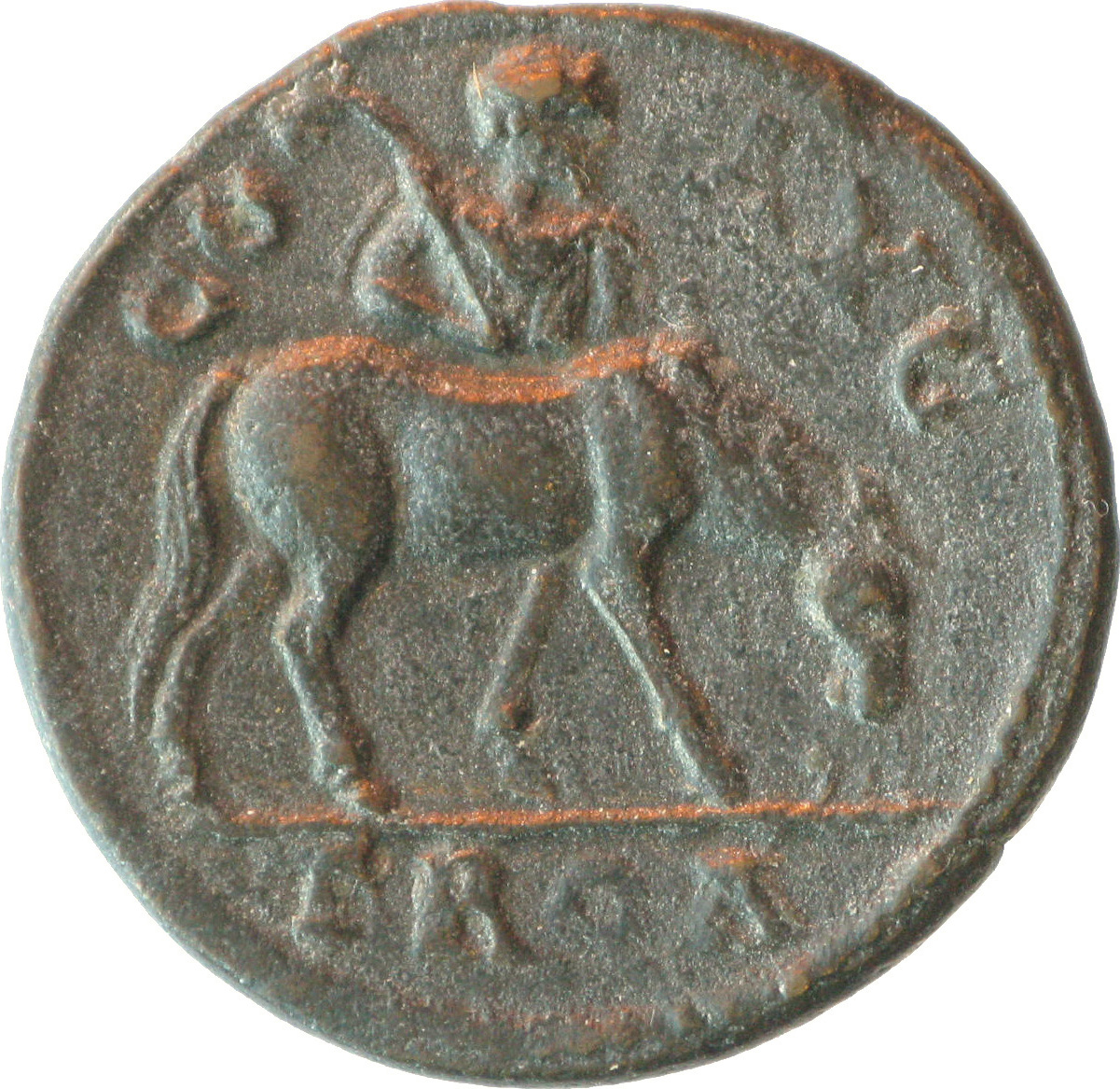 laureate, draped and cuirassed bust of Volusian, right, seen from rear