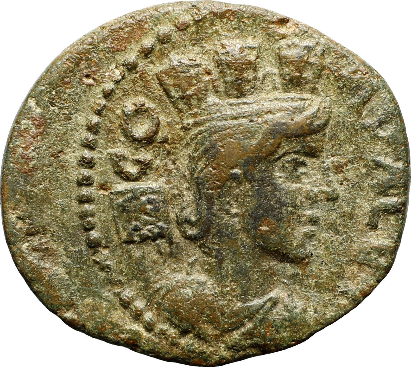 draped bust of Tyche, right; behind her, vexillum inscribed CO AV