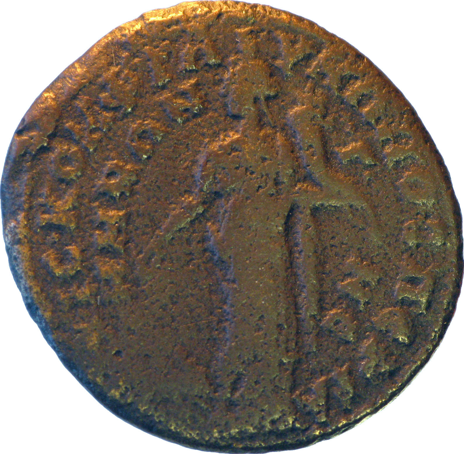 Tyche standing left, holding rudder and cornucopia |