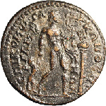 nude Hermes walking, right, holding ram by forelegs, caduceus and chlamys; at right, head of ram on column |